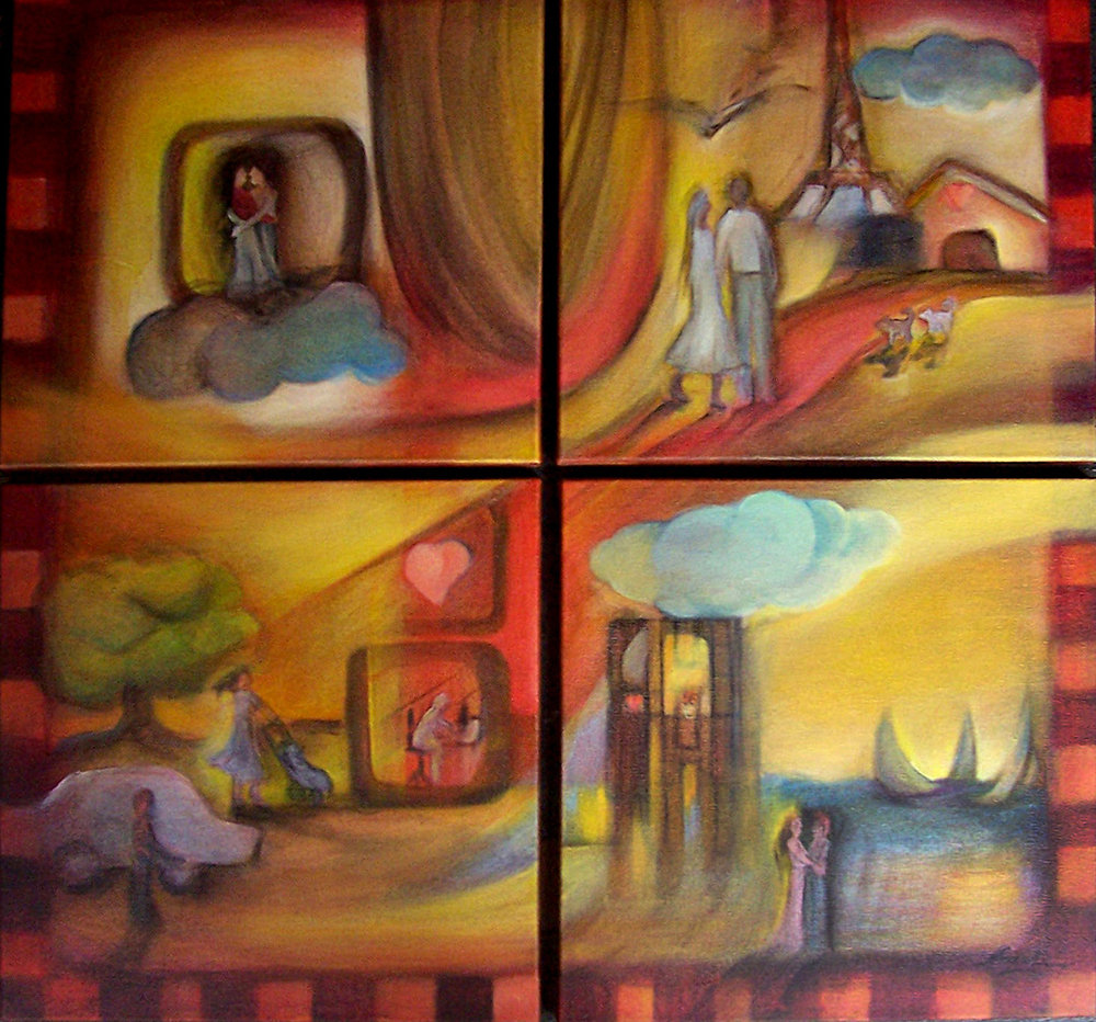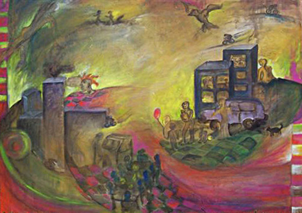 Esta es una interpretación personal, enfocada entre la verdad y la sátira, muestra al ser y su mundo envuelto en el día a día, en un entorno variado donde compiten lo cotidiano y lo cósmico. Se resaltan imágenes del pensador, el lector y el observador, frente al veloz ciclista que corre aturdido sin rumbo fijo, como una forma de vida del hombre de hoy; hay muchos personajes coexistiendo entre el orden y el caos y la presencia de las ventanas recuerdan simbólicamente que hay algo mágico por descubrir y que siempre es posible ver la luz…